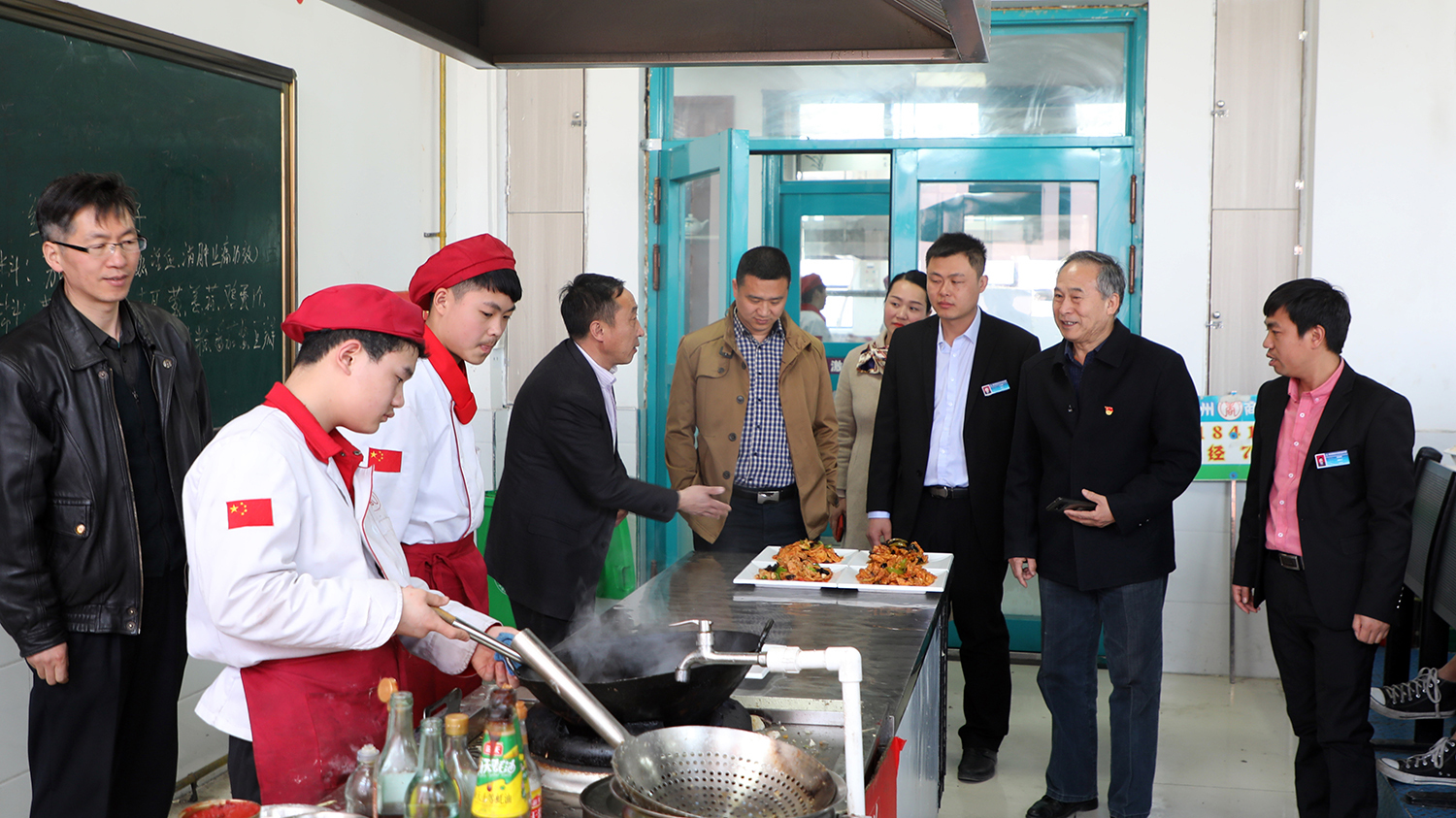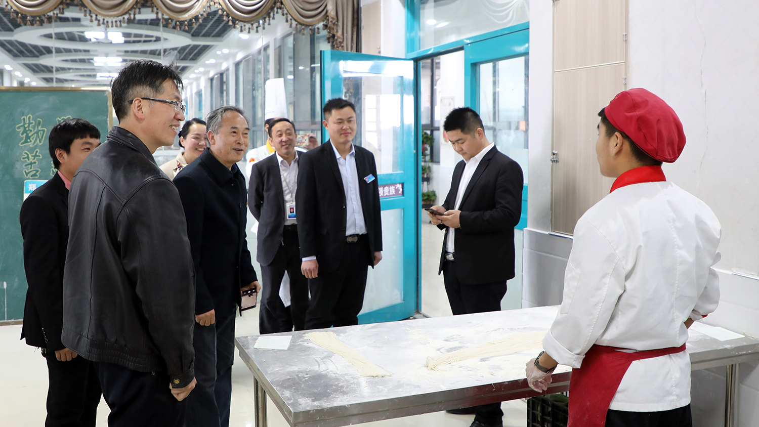 專家組觀看廚師專業(yè)學(xué)生實訓(xùn)操作