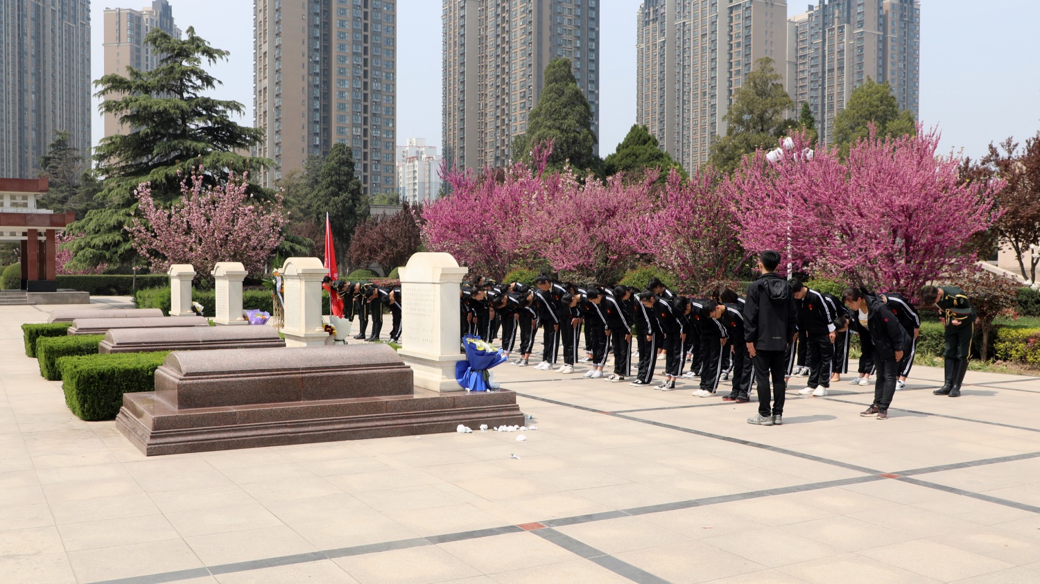 師生在革命先烈墓碑前默哀鞠躬