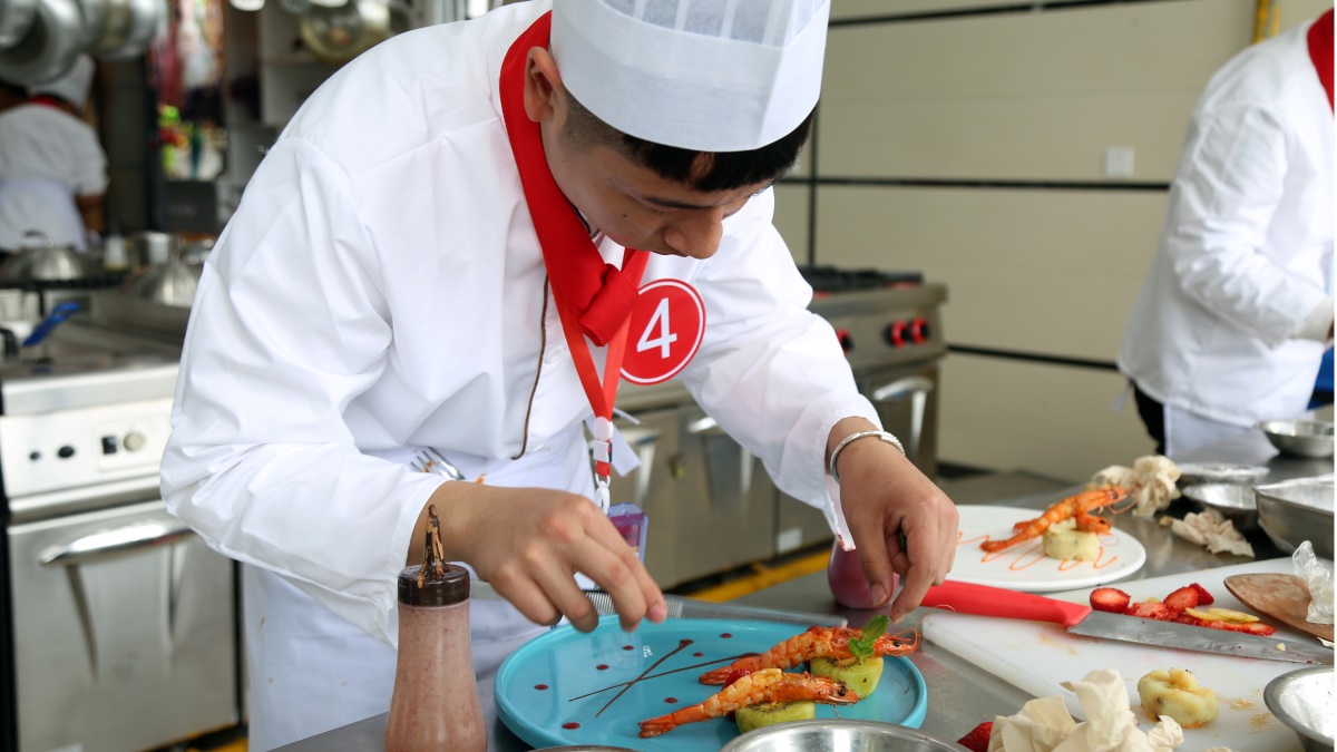 上午9:00,四項競技賽事同時拉開帷幕,參賽選手們嚴(yán)格遵守比賽規(guī)程,在相互切磋、共同提高中賽出了醇厚的友誼和優(yōu)異的成績。中餐烹調(diào)賽項競技場上,選手們通過遴選優(yōu)質(zhì)的原料、亮相精湛的刀工、展示嫻熟的烹飪技能以及或旺或微的適宜火候,翻出了一道道色香味意形養(yǎng)俱佳的參賽作品;西式烹調(diào)賽項比賽中,選手們通過或煎、或焗、或炸、或烤、或燴、或蒸等,打造一道集法國菜、英國菜、意大利菜等異國風(fēng)情、精細(xì)考究的靚麗風(fēng)景線;中餐面點賽項競技中,選手們通過包、捏、卷、按、搟、疊、切、攤、剪、搓、抻等技法,薈萃了花樣繁多、令人垂涎的面點精品;冷拼與食雕賽項競技中,選手們自選材料,現(xiàn)場切、配、拼、擺出風(fēng)情萬種的冷拼和或果蔬、或黃油等精雕細(xì)琢出栩栩如生的食雕作品,讓人駐足回味。